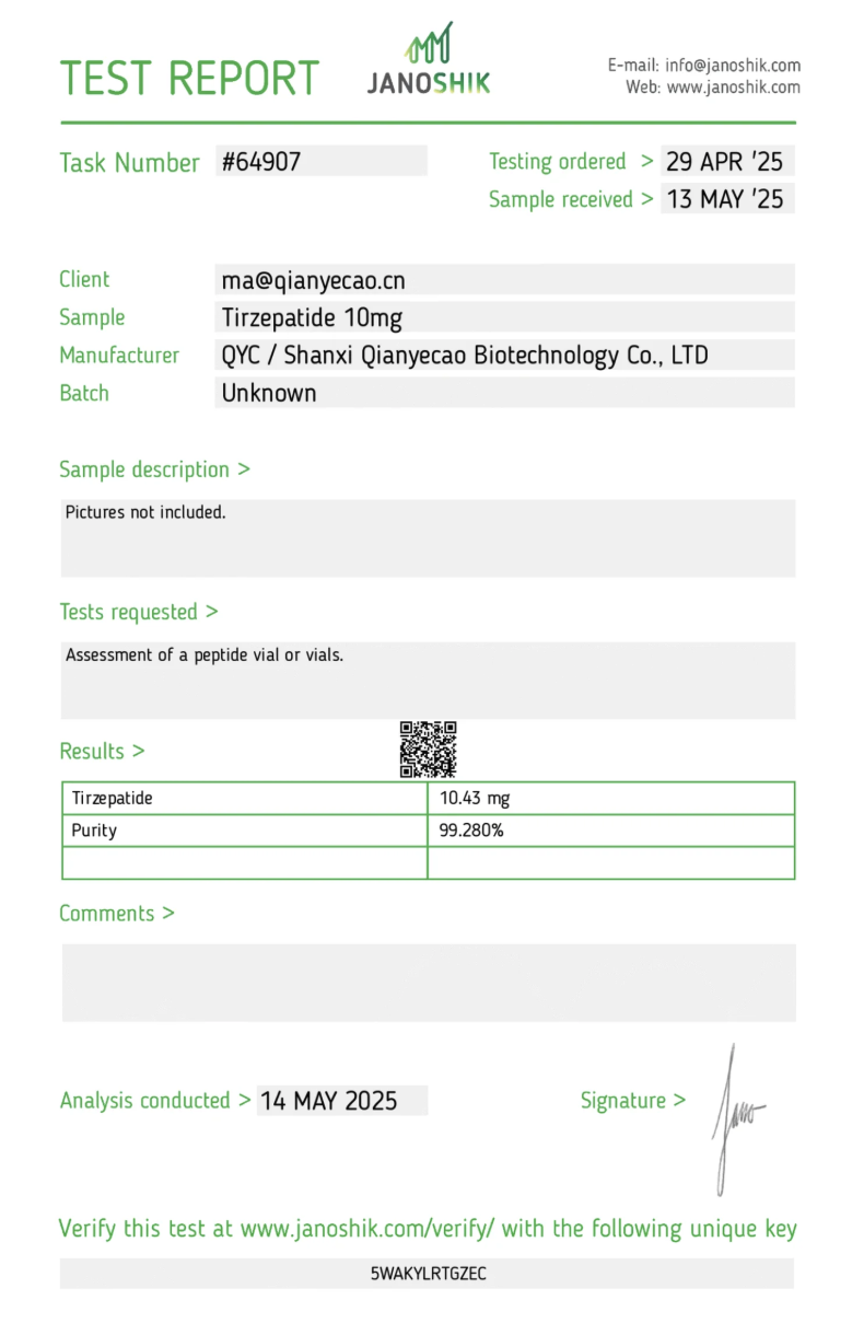 Each vial of GLP-2 TZ (30 mg) is securely packaged with a tamper-evident seal and includes full batch and lot traceability. A Certificate of Analysis (COA) is provided with each lot, verifying peptide identity and purity through HPLC/LC-MS. For added assurance, third-party verification is available through Janoshik.