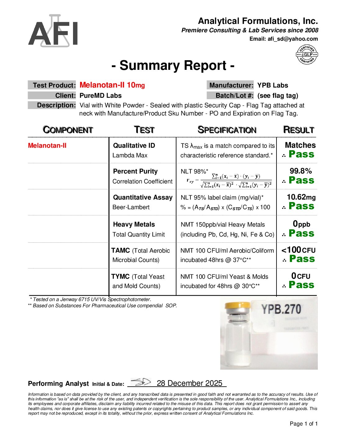 Melanotan 2 (10 mg) is a single-component, research-grade peptide supplied for controlled laboratory environments. This material is suitable for non-clinical studies involving melanocortin receptor pathway characterization, including MC1R and MC4R model systems, as well as analytical and methodological development within research-based model systems. The peptide is provided in a lyophilized format to support stability, traceability, and reproducibility across laboratory workflows.