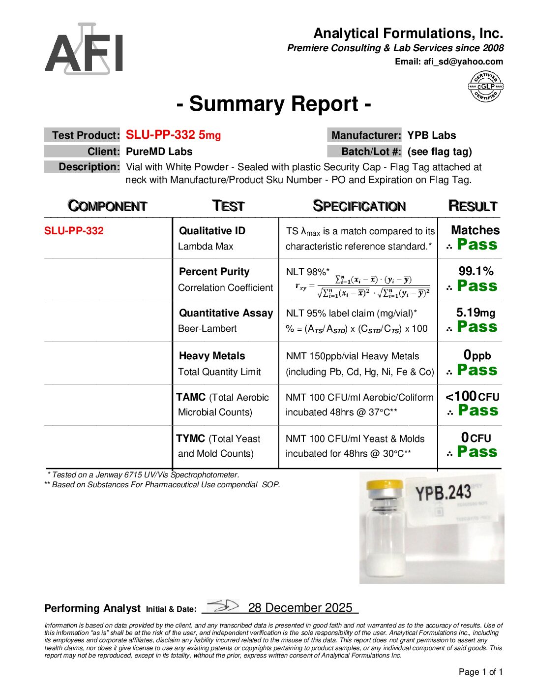 SLU-PP-332 (5 mg) is a single-component, research-use peptide material supplied as a lyophilized powder for qualified laboratory professionals operating in controlled, non-clinical environments. It is positioned for advanced investigations exploring metabolic regulation, mitochondrial function, and peptide signaling pathways in validated model systems. Each vial is prepared for reproducible workflow integration across analytical method development, assay optimization, and pathway mapping research where traceability and consistent handling standards are required.